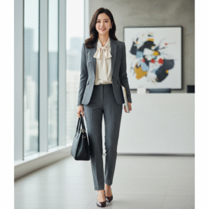 - Quality Fabrics:Â Opt for materials like wool blends, silk, and cotton that look luxurious and are comfortable all day.